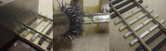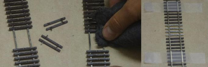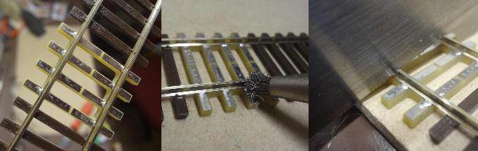 -- clean the underside of the rail only, with fine 0000 steel wool. This can also be done with pre-weathered rail.