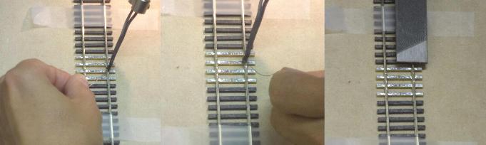 -- Apply a small amount of fine (0.025") rosin-flux silver-bearing solder to the joint between the rail base and the Gapmaster metal top. Do this to all joint areas, starting at the middle two ties and working outward. Remove heat as soon as the solder flows, to avoid damaging the plastic ties. Note: many modelers have had great success with resistance soldering units.
